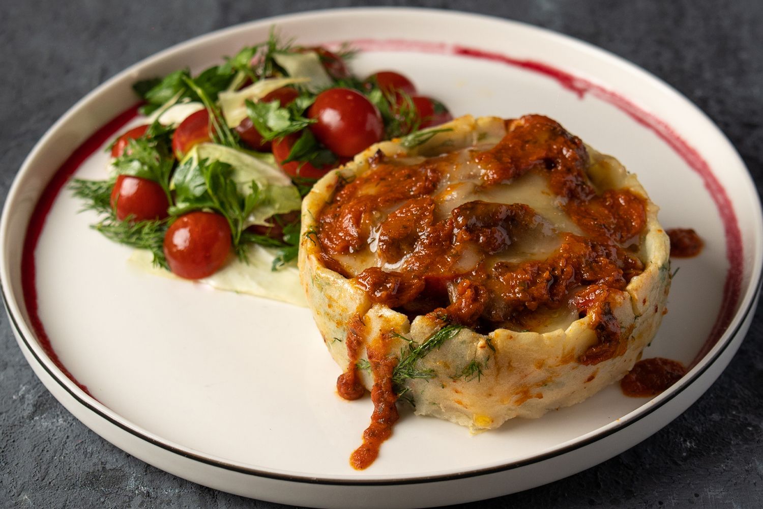 Yeralma, petruska, towuk doş, paprika, tomat sousy, miks salad.