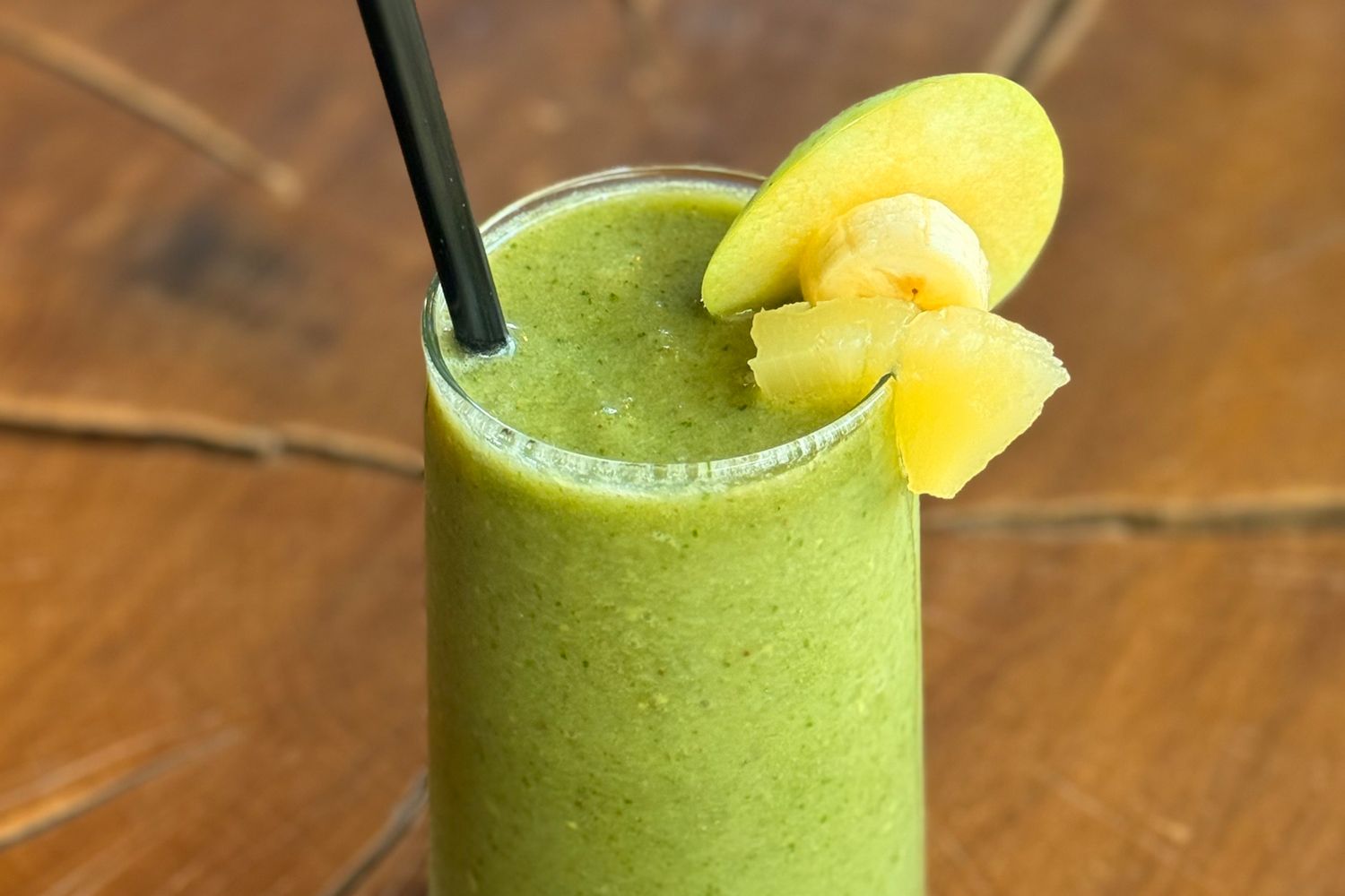 A smoothie is a thick blended beverage with shake like consistency, normally pureed in a blender containing fruits.