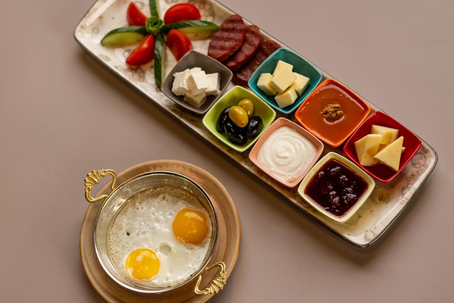 Fried eggs, sausage, tomato, greenery, cheese, olives, honey, butter, jam
