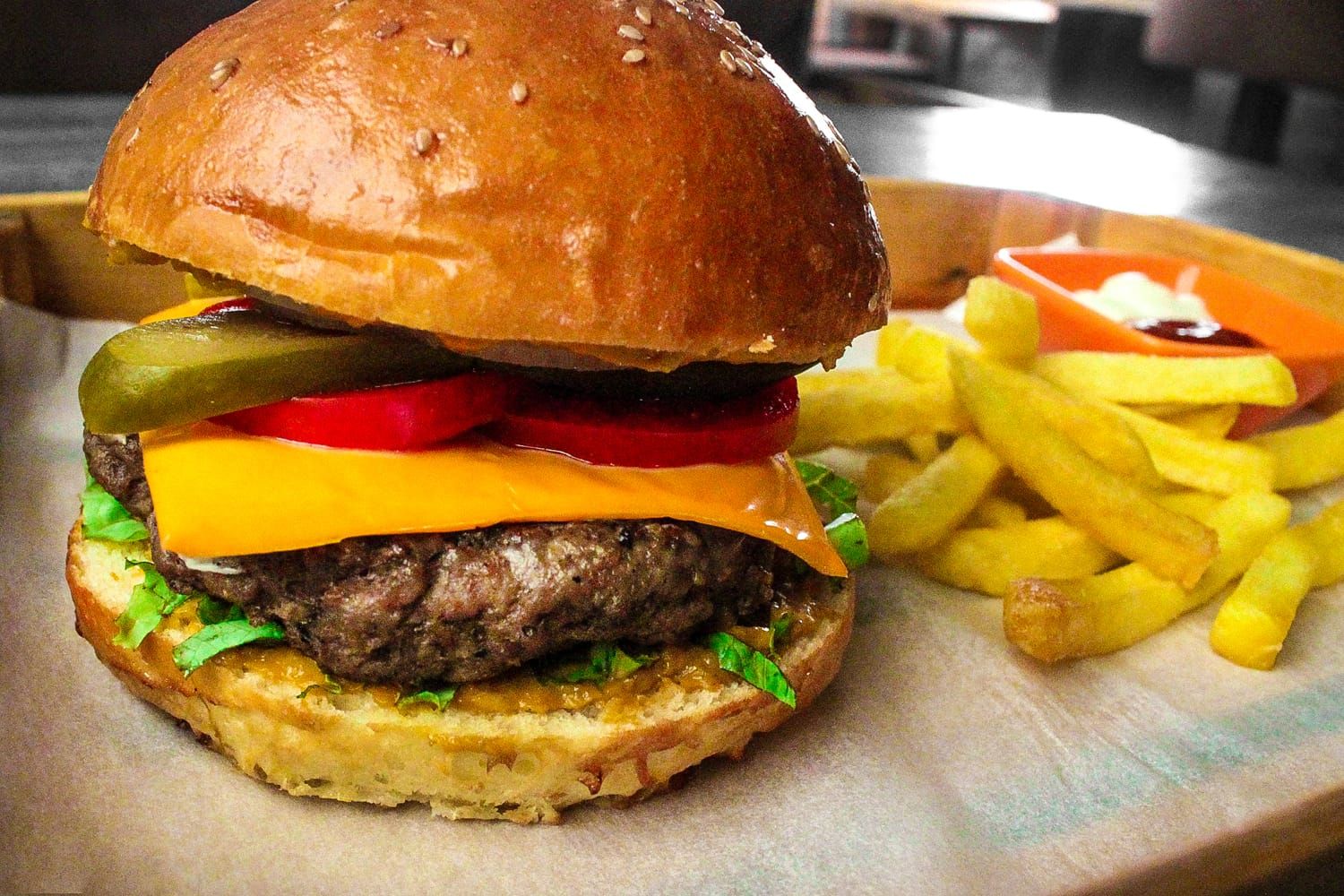 Beef, salted cucumbers, sliced onion and tomato, crisp lettuce leaves, burger sauce also involved.