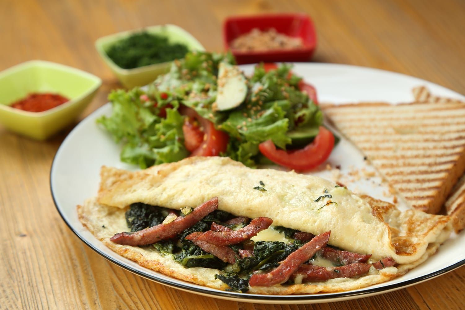 Omelette with spinach and salami