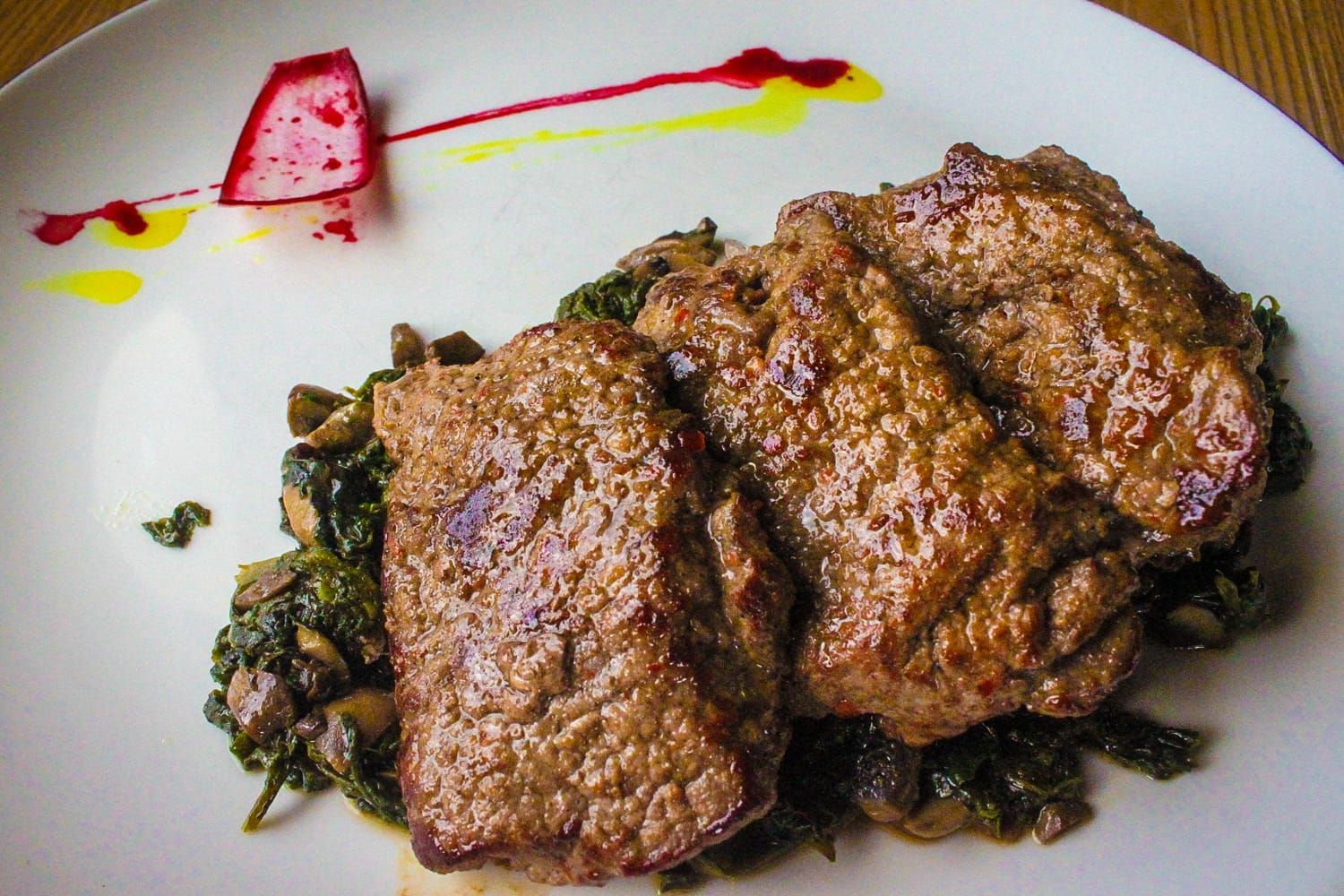 Bon fillet 180g with spinach, mushrooms with onions in butter & greenery